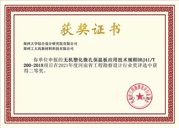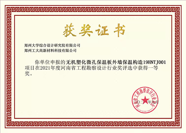 近日,“2021年度河南省工程勘察設(shè)計行業(yè)獎評選”揭曉,由鄭州大學綜合設(shè)計研究院有限公司與我司共同申報的“無機塑化微孔保溫板外墻保溫構(gòu)造19HNTJ001”、“無機塑化微孔保溫板應(yīng)用技術(shù)規(guī)程DBJ41/T 200-2018”項目分別榮獲一、二等獎。
