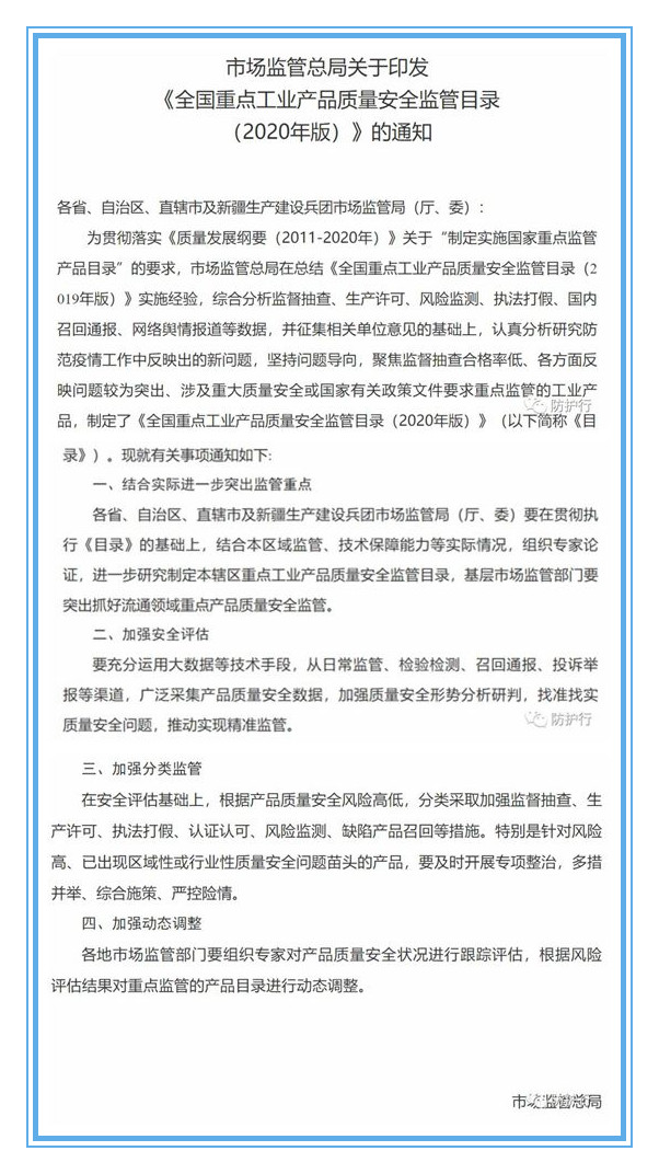 近日,市場監管總局對《全國重點工業產品質量安全監管目錄(2019年版)》實施經驗進行總結,綜合分析數據,結合實際情況,征集相關單位意見,制定了《全國重點工業產品質量安全監管目錄(2020年版)》。